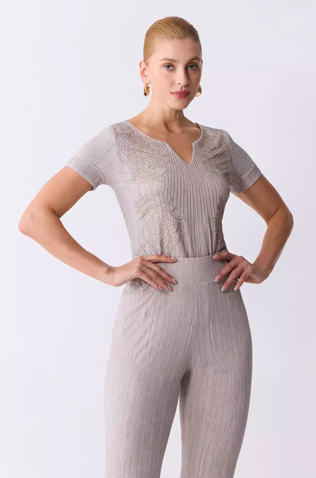 Blusa Danny Confeccionada em Fluity, o Decote Redondo com Recorte em V Valoriza a Silhueta de Forma Sutil, com a Aplicação Artesanal de Cristais Que Combina Tons Foscos e Brilhantes, Criando Um Contraste Sofisticado e Cheio de Personalidade. Caimento Impecável Garante Conforto Ao Longo do Dia. Faz Conjunto com a Calça Danny, Criando Uma Proposta Moderna e Sofisticada para Diferentes Momentos da Rotina.